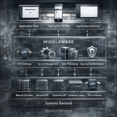 Le schéma suivant illustre l’architecture logicielle d’un middleware positionné entre plusieurs applications front-end (partie visible d’une application ou d’un site web : ce que l’utilisateur voit et avec quoi il interagit) et des systèmes backend (partie invisible, côté serveur, qui s’occupe de la logique et des données).